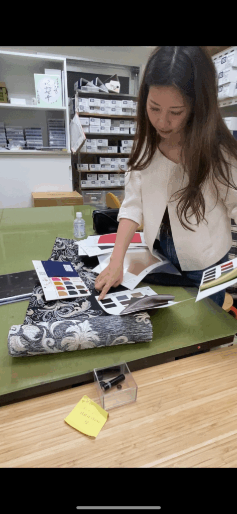 She works on upcycled interior products using antique kimono fabrics in Tokyo. Each piece is carefully created by hand.